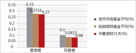 华夏理财21天认购费、申购费、赎回费均为0,管理费与托管费之和甚至比货币市场基金还低19%。